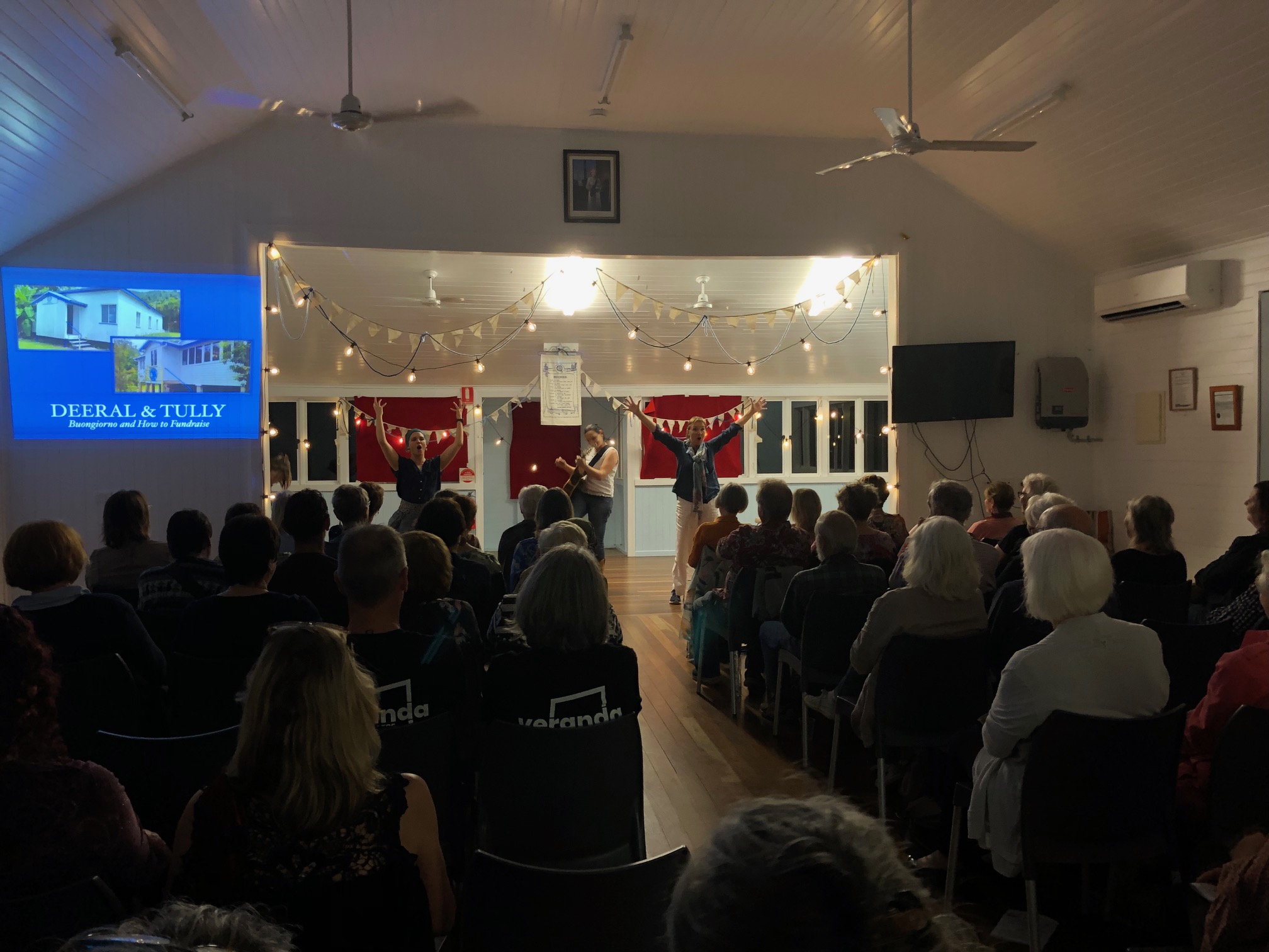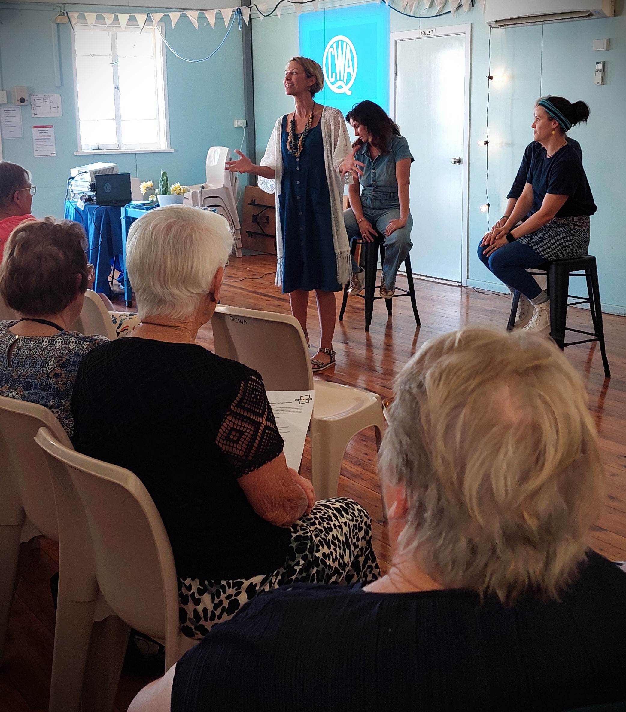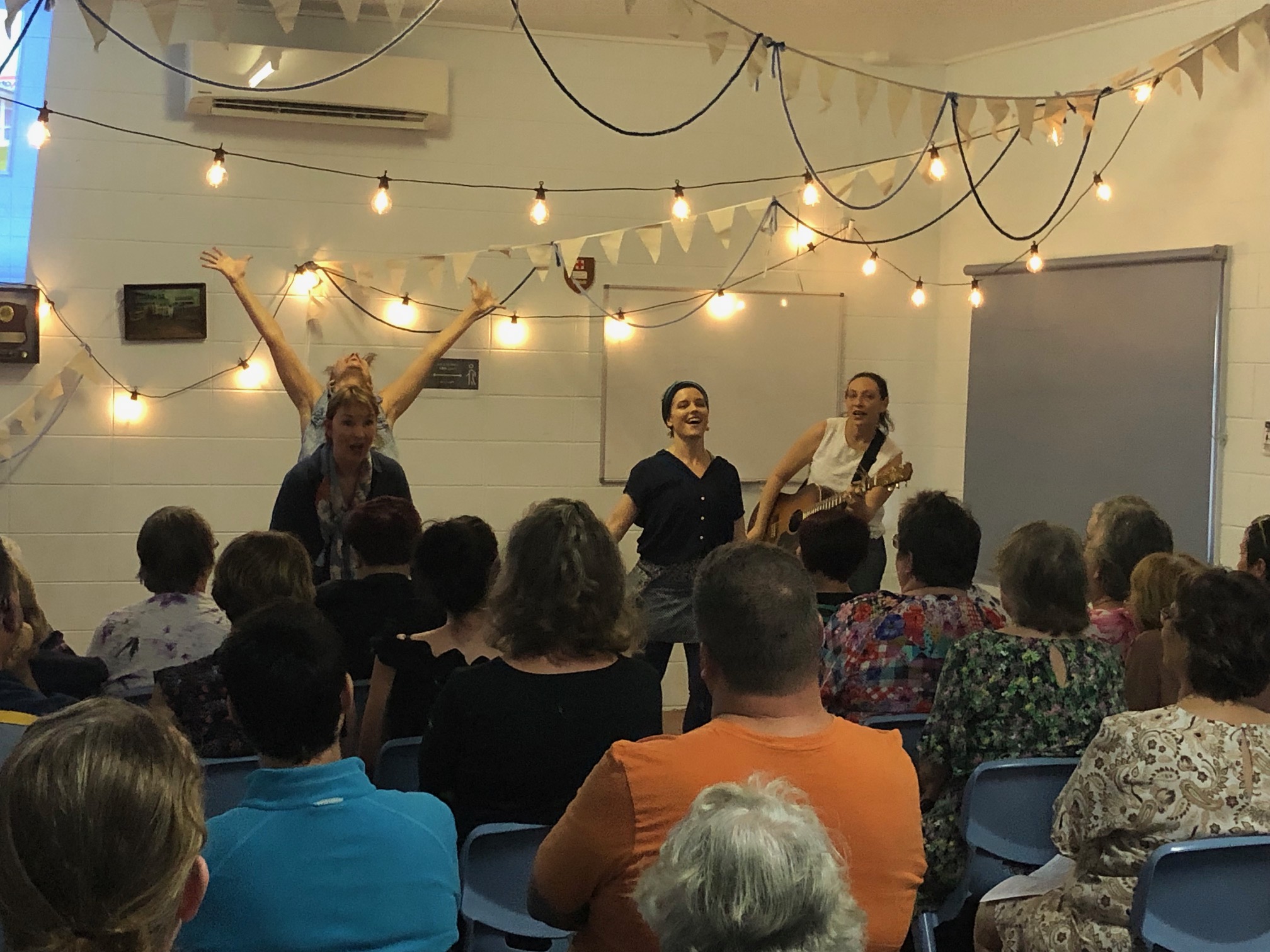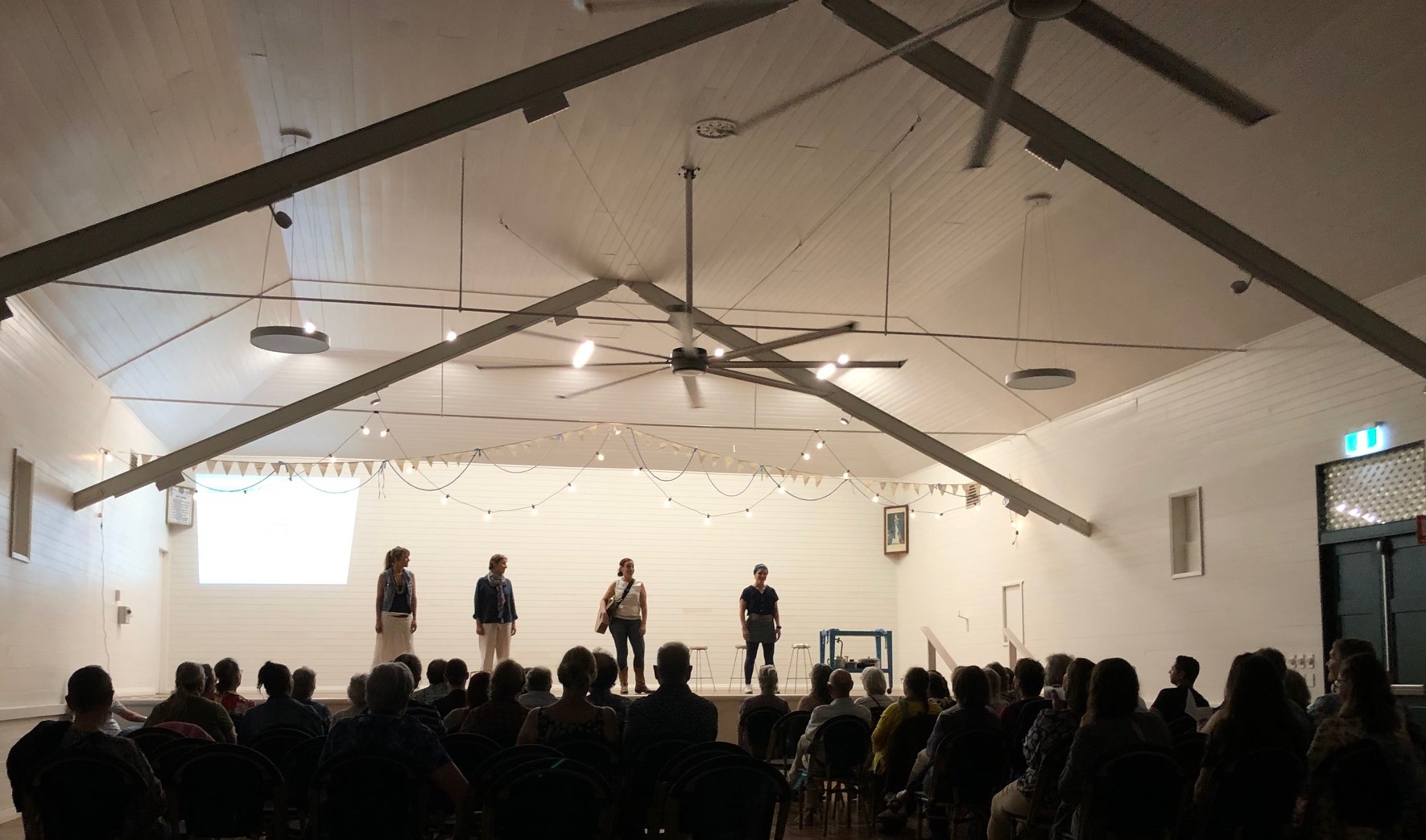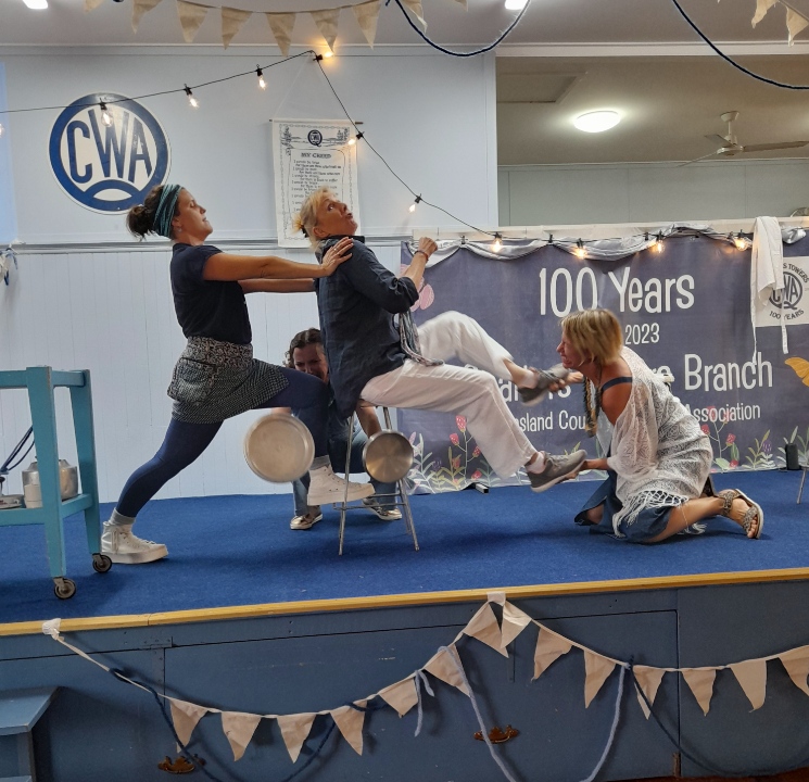 Professional Production  (Stage 3, May 2023 – June 2023 – FNQ Tour) –  This work is a form of verbatim theatre, where real stories, based on recorded interviews, are blended with dramatised scenes.  While the stories were edited, they kept the truth and of the original voices, ensuring the work’s authenticity.  A rich, diversity of CWA journeys was condensed into chapters, and united by actors, choreography, projection and music.  It toured QCWA Halls in Far North Queensland and where possible, was performed in-situ, using authentic CWA Hall sets.  The camaraderie, gritty moments and the laugh-out-loud recollections of what these generous women do, was revealed at the Freshwater CWA Hall, Clink Theatre Port Douglas,Tolga CWA Hall, Cooktown Shire Hall, Mareeba CWA Hall, Tully CWA Hall and Millaa Millaa CWA Hall.